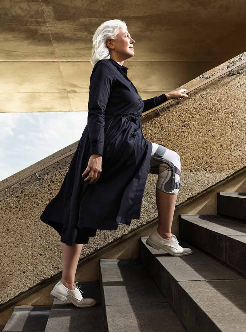 Стабилизацията се осъществява чрез две неаксиални шарнирни пружини, които следват нормалната биомеханика на коляното. Това позволява свободно сгъване и разгъване на ставата, като същевременно осигурява надеждна защита. Металните пружини остават стабилни и в правилна позиция при всяко движение, което намалява риска от допълнителни увреждания.