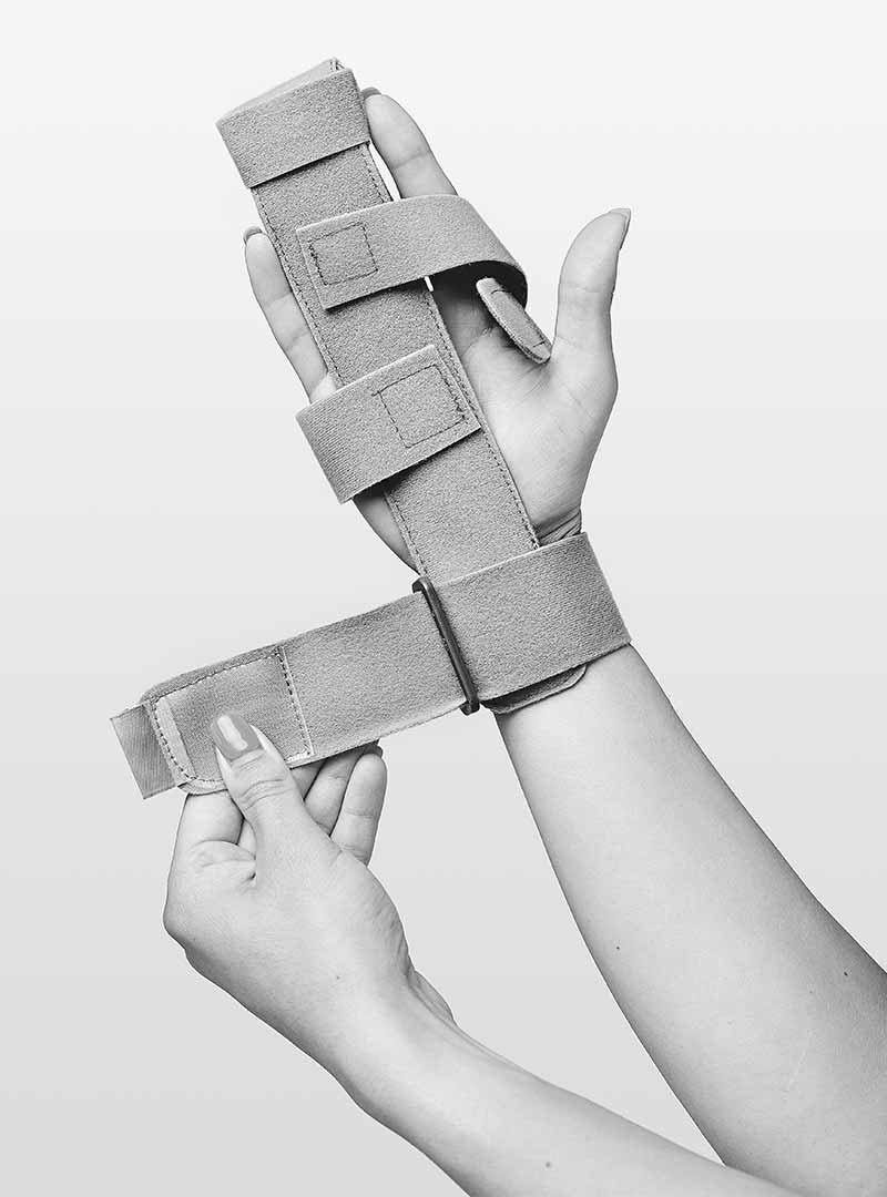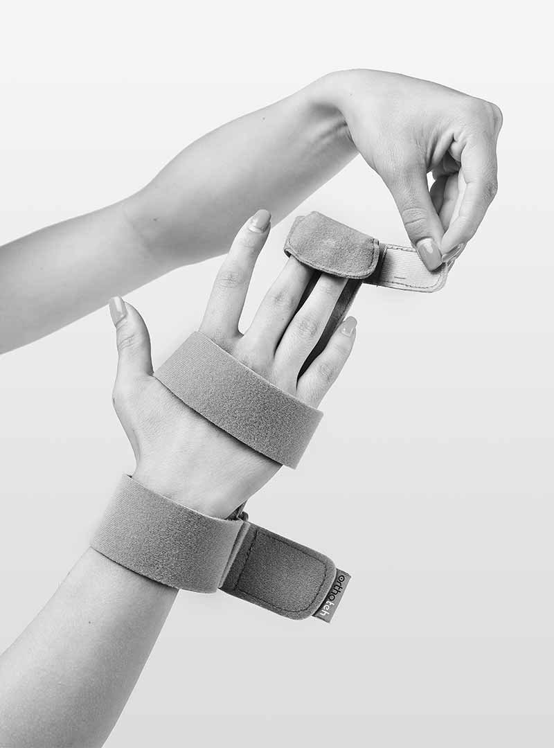 Ортезата разполага с четири омекотени, нееластични ленти и една катарама за сигурно и персонализирано прикрепване към ръката. Това позволява точно пристягане без риск от притискане или дискомфорт.