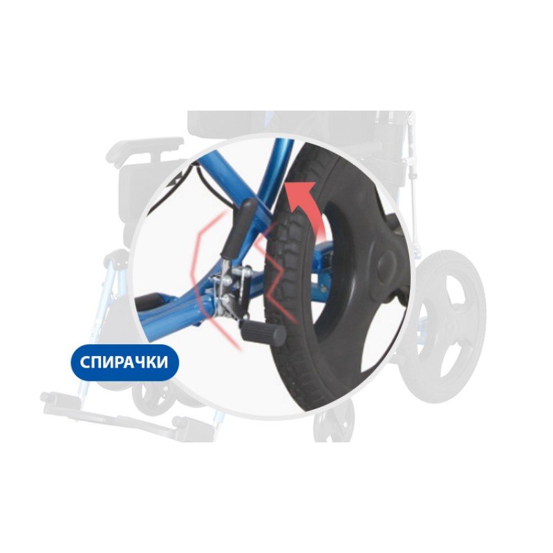 Количката разполага с твърди PU гуми – както предни, така и задни – които позволяват лесно придвижване по различни терени. Регулируемата подпора за главата допринася за добрата стойка и предпазва врата от умора при продължителен престой в количката.
